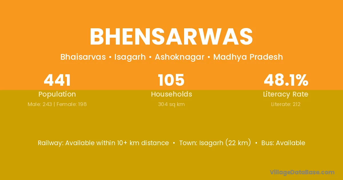 Isagarh (22 km) is the nearest town to Bhensarwas village for major economic activities and is located approximately 22 km away.