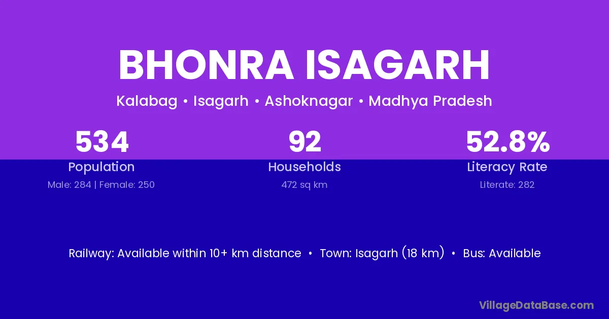 Isagarh (18 km) is the nearest town to Bhonra Isagarh village for major economic activities and is located approximately 18 km away.