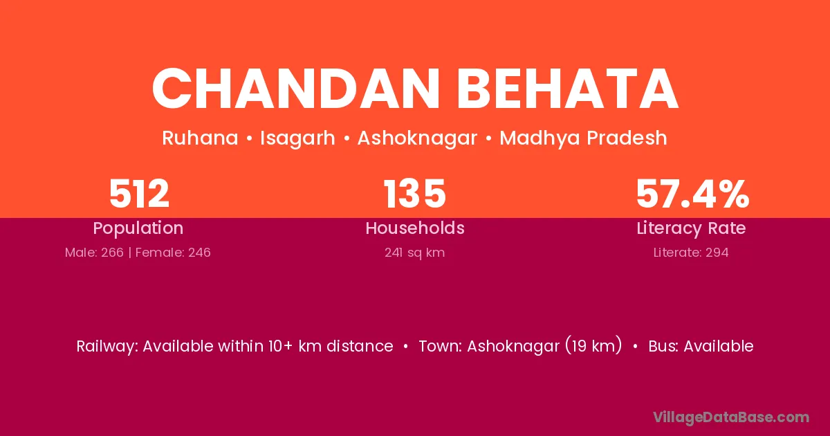 Ashoknagar (19 km) is the nearest town to Chandan Behata village for major economic activities and is located approximately 19 km away.