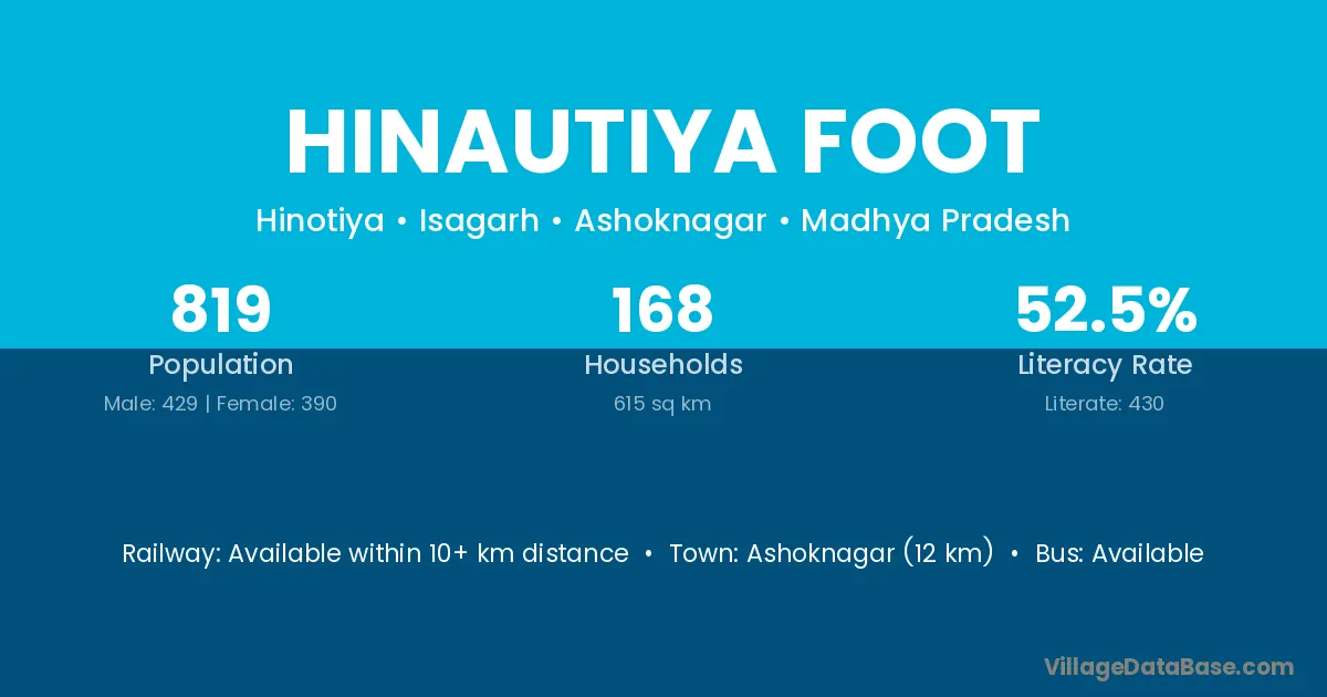 Ashoknagar (12 km) is the nearest town to Hinautiya Foot village for major economic activities and is located approximately 12 km away.