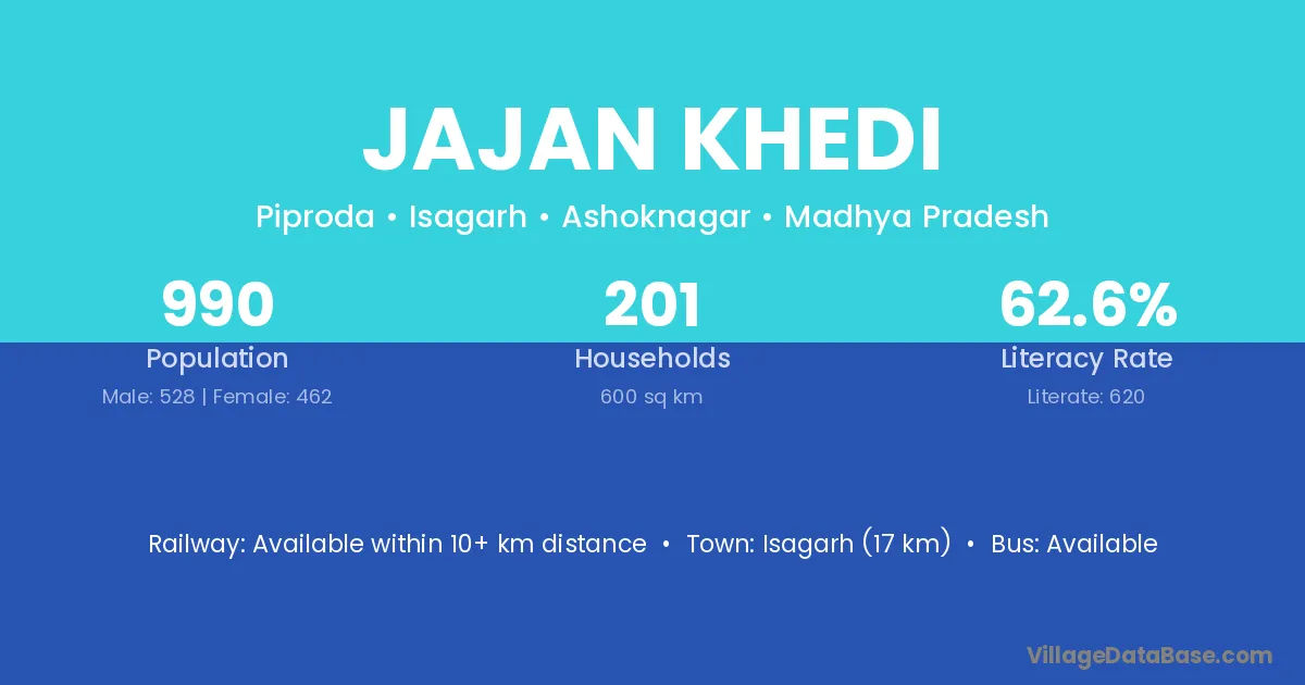 Isagarh (17 km) is the nearest town to Jajan Khedi village for major economic activities and is located approximately 17 km away.