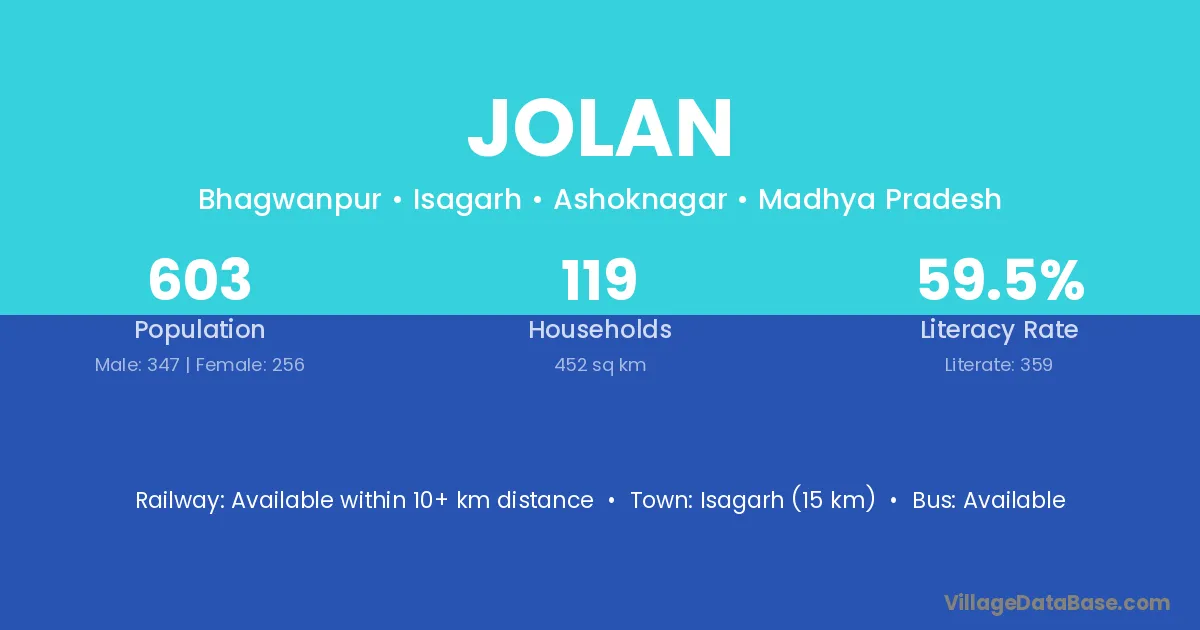 Isagarh (15 km) is the nearest town to Jolan village for major economic activities and is located approximately 15 km away.