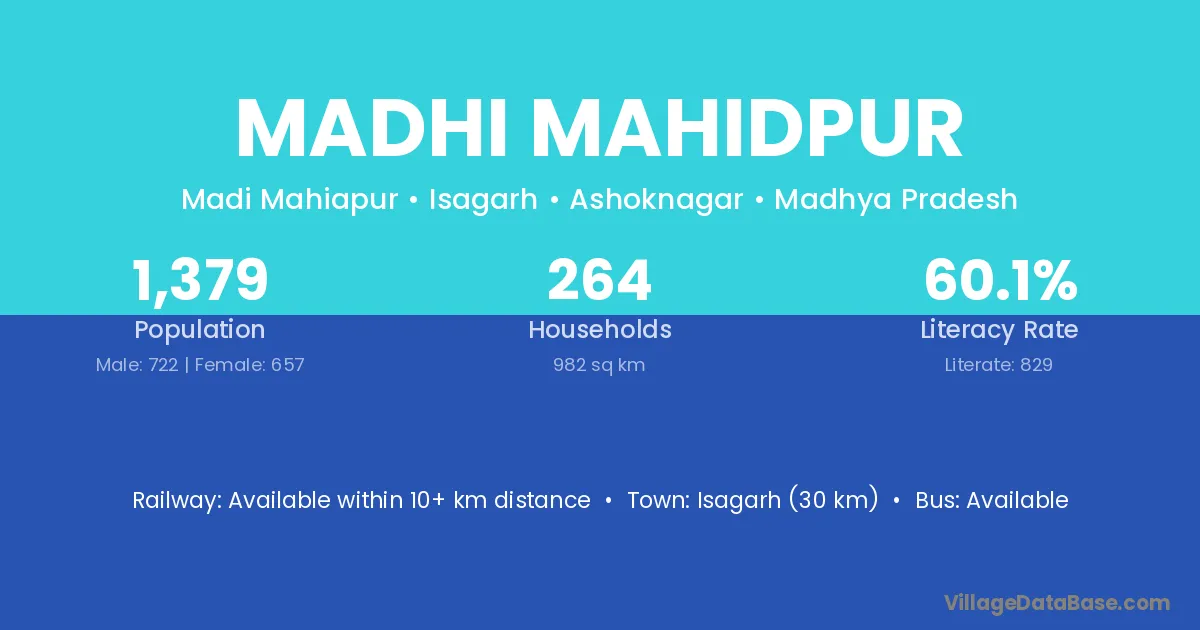 Isagarh (30 km) is the nearest town to Madhi Mahidpur village for major economic activities and is located approximately 30 km away.