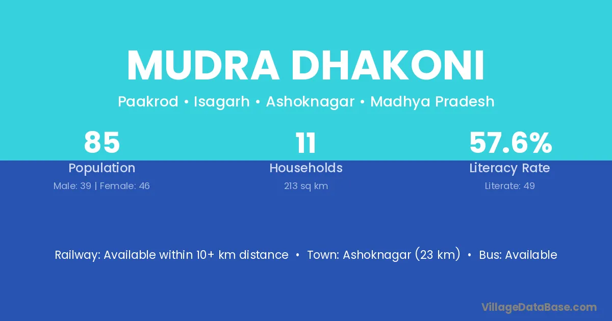 Ashoknagar (23 km) is the nearest town to Mudra Dhakoni village for major economic activities and is located approximately 23 km away.