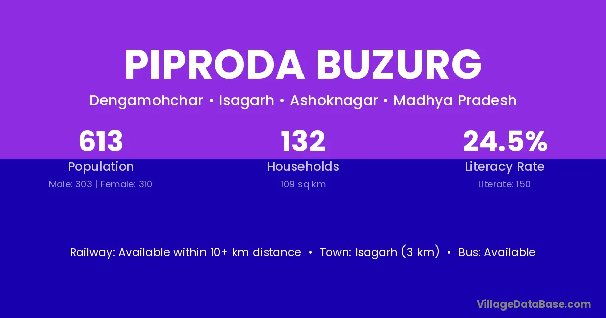 Isagarh (3 km) is the nearest town to Piproda Buzurg village for major economic activities and is located approximately 3 km away.