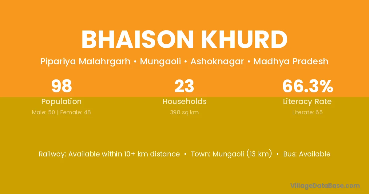 Mungaoli (13 km) is the nearest town to Bhaison Khurd village for major economic activities and is located approximately 13 km away.