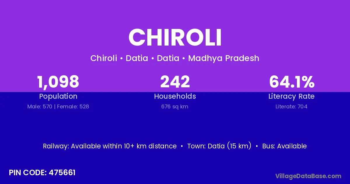 Mungaoli (23 km) is the nearest town to Chiroli village for major economic activities and is located approximately 23 km away.