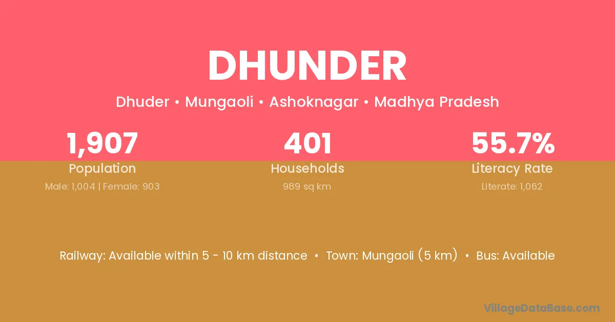 Mungaoli (5 km) is the nearest town to Dhunder village for major economic activities and is located approximately 5 km away.