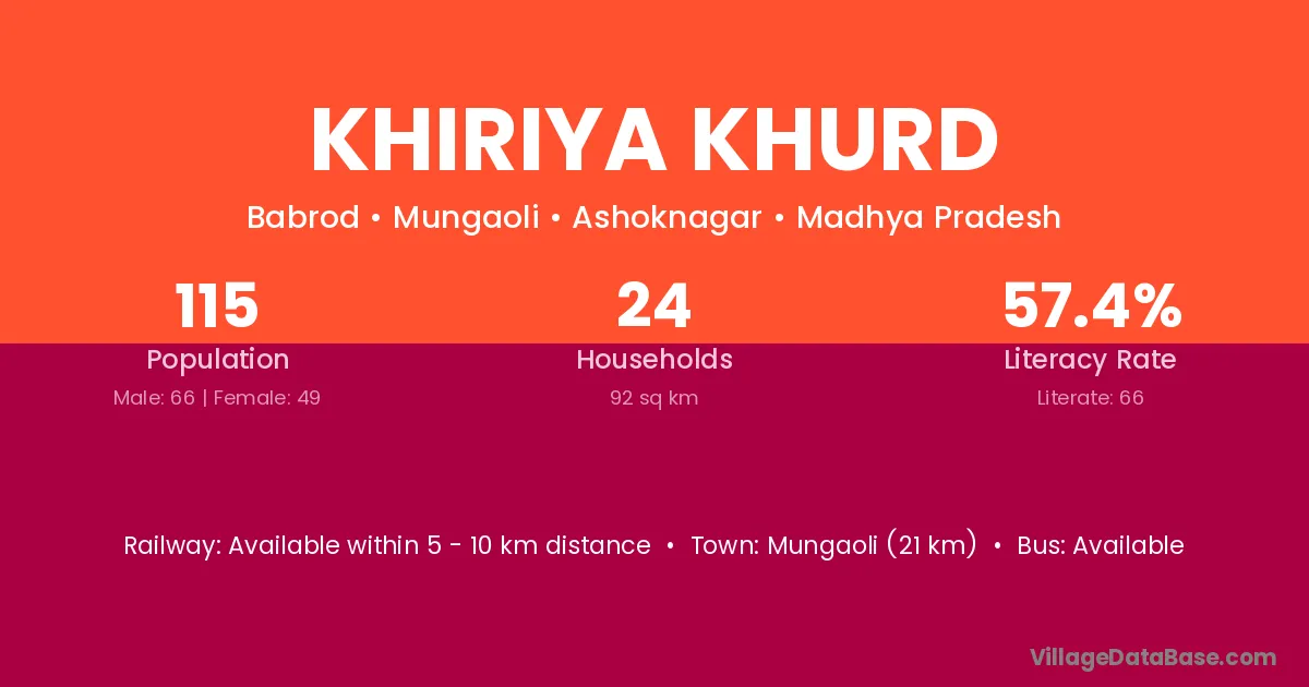 Khiriya Khurd village has a total population of 115 people, of which 66 are males and 49 are females.