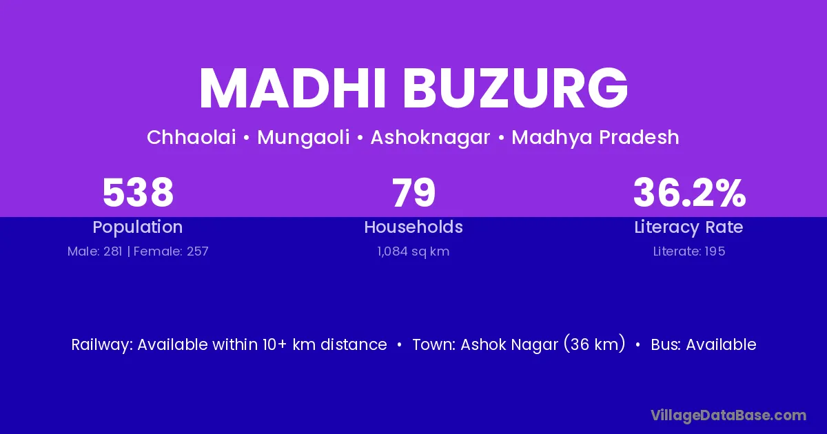 Ashok Nagar (36 km) is the nearest town to Madhi Buzurg village for major economic activities and is located approximately 36 km away.