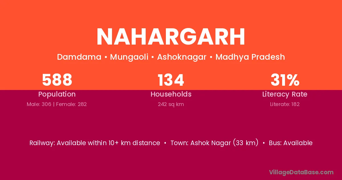 Ashok Nagar (33 km) is the nearest town to Nahargarh village for major economic activities and is located approximately 33 km away.