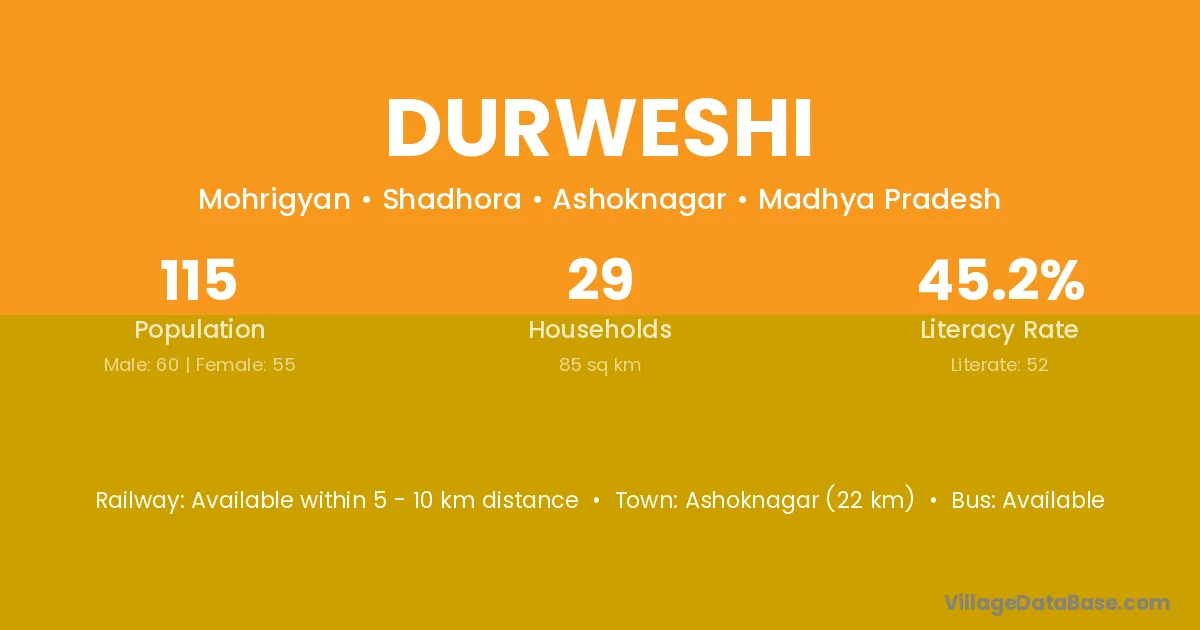 Ashoknagar (22 km) is the nearest town to Durweshi village for major economic activities and is located approximately 22 km away.