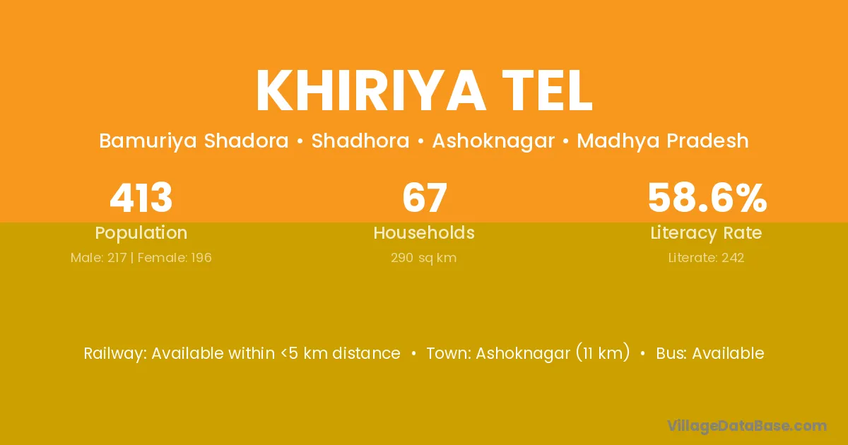 Ashoknagar (11 km) is the nearest town to Khiriya Tel village for major economic activities and is located approximately 11 km away.