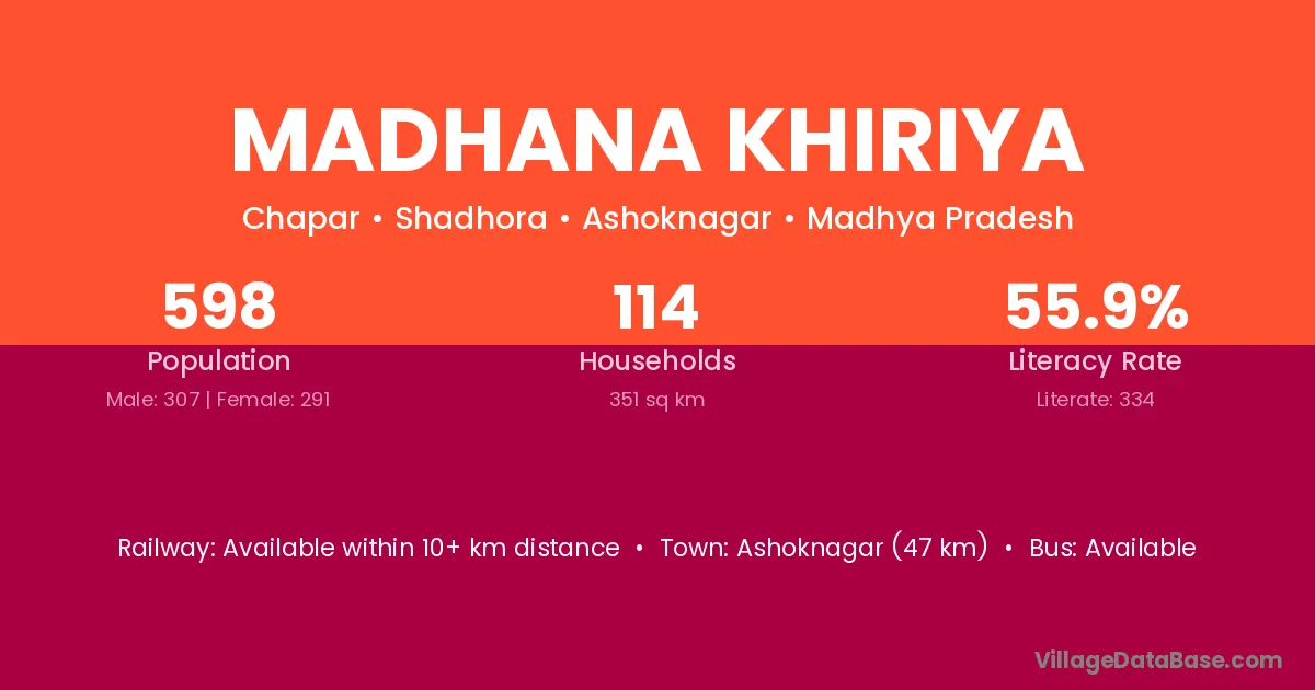 Madhana Khiriya village has a total population of 598 people, of which 307 are males and 291 are females.