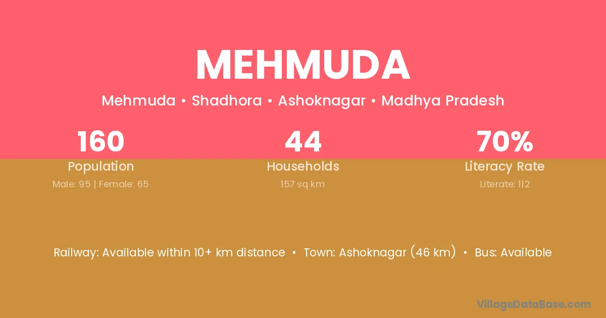 Ashoknagar (46 km) is the nearest town to Mehmuda village for major economic activities and is located approximately 46 km away.