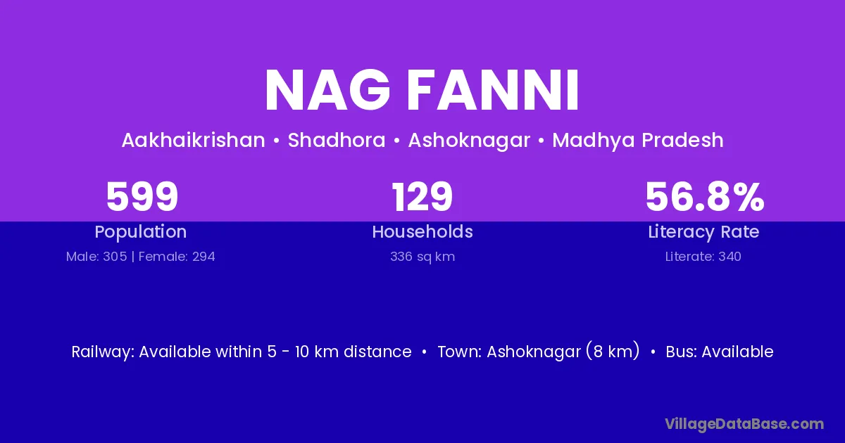 Ashoknagar (8 km) is the nearest town to Nag Fanni village for major economic activities and is located approximately 8 km away.