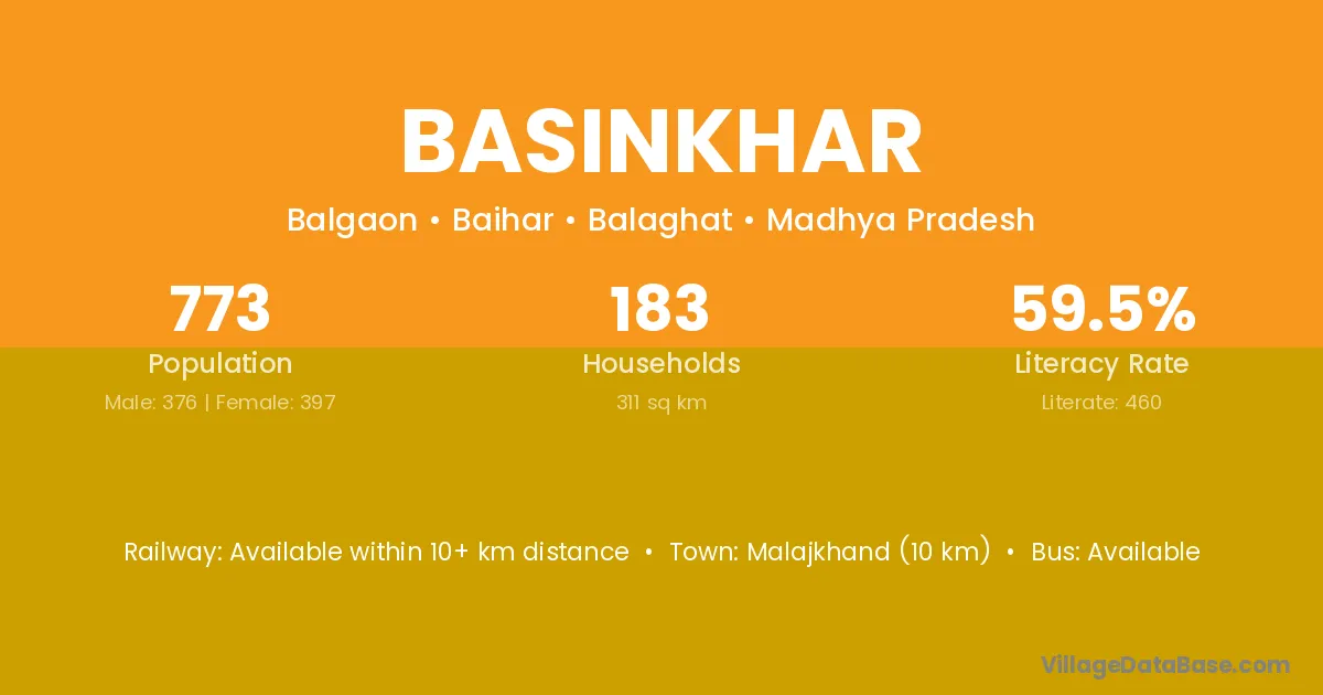 Malajkhand (10 km) is the nearest town to Basinkhar village for major economic activities and is located approximately 10 km away.