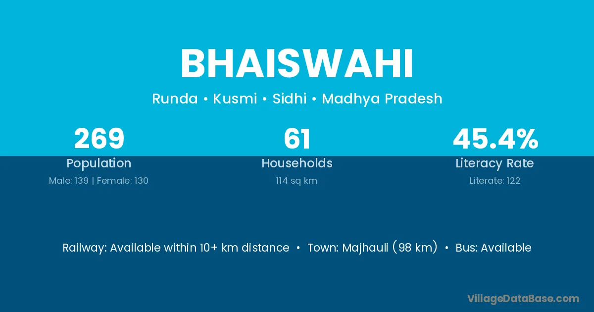 Baihar (9 km) is the nearest town to Bhaiswahi village for major economic activities and is located approximately 9 km away.