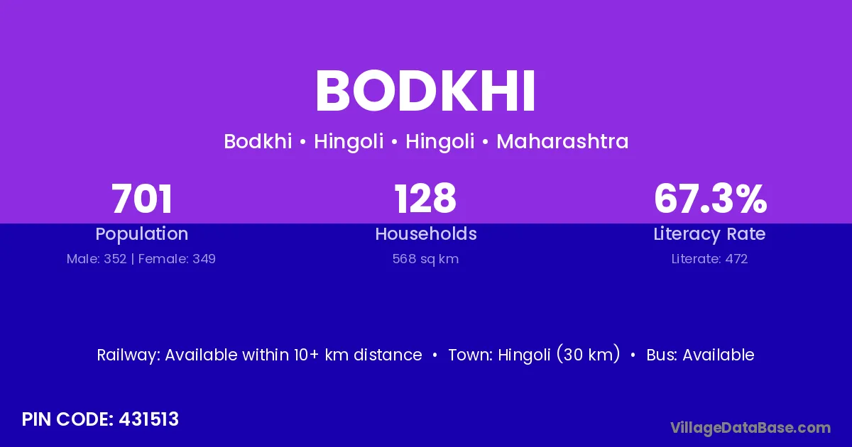 Bodkhi village has a total population of 59 people, of which 30 are males and 29 are females.