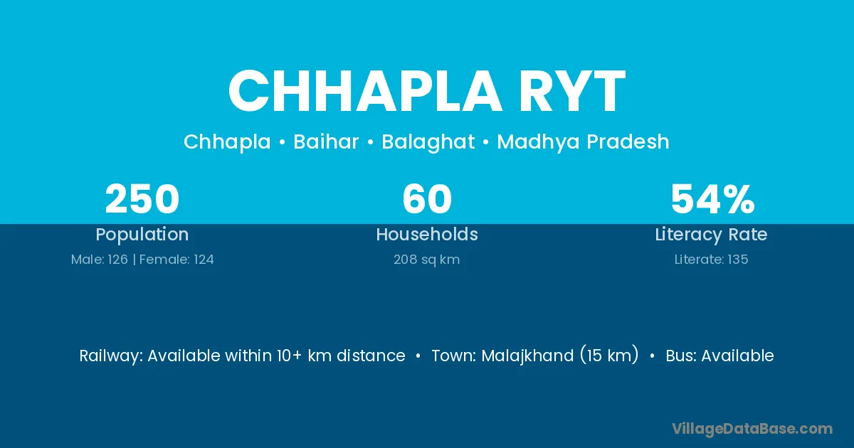 Malajkhand (15 km) is the nearest town to Chhapla Ryt village for major economic activities and is located approximately 15 km away.