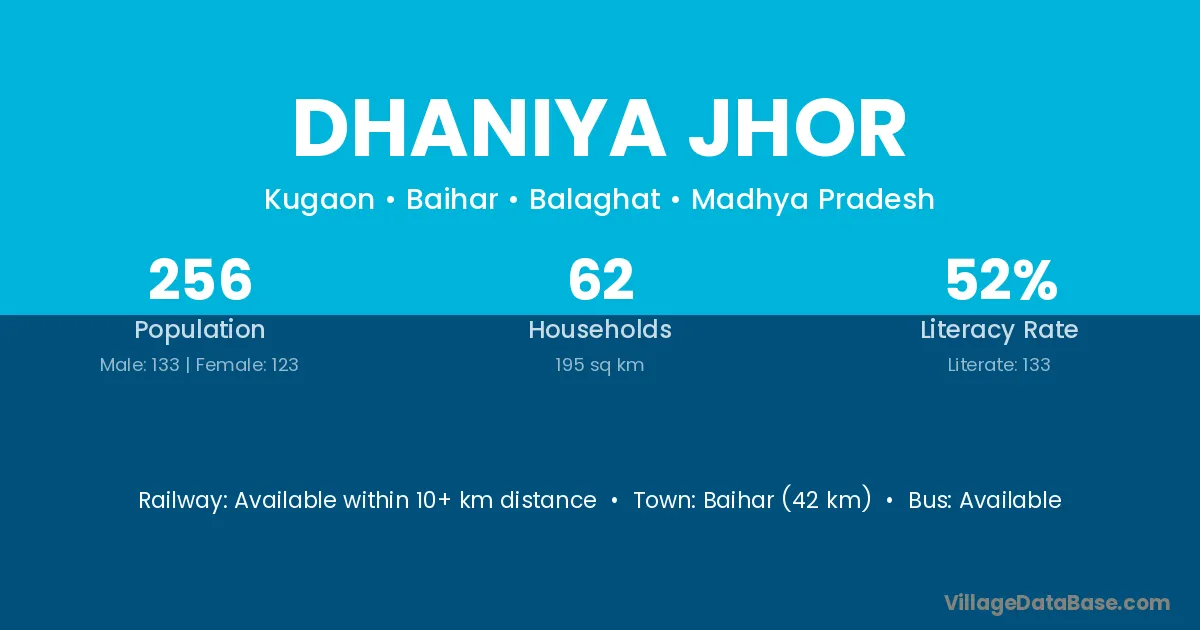 Baihar (42 km) is the nearest town to Dhaniya Jhor village for major economic activities and is located approximately 42 km away.