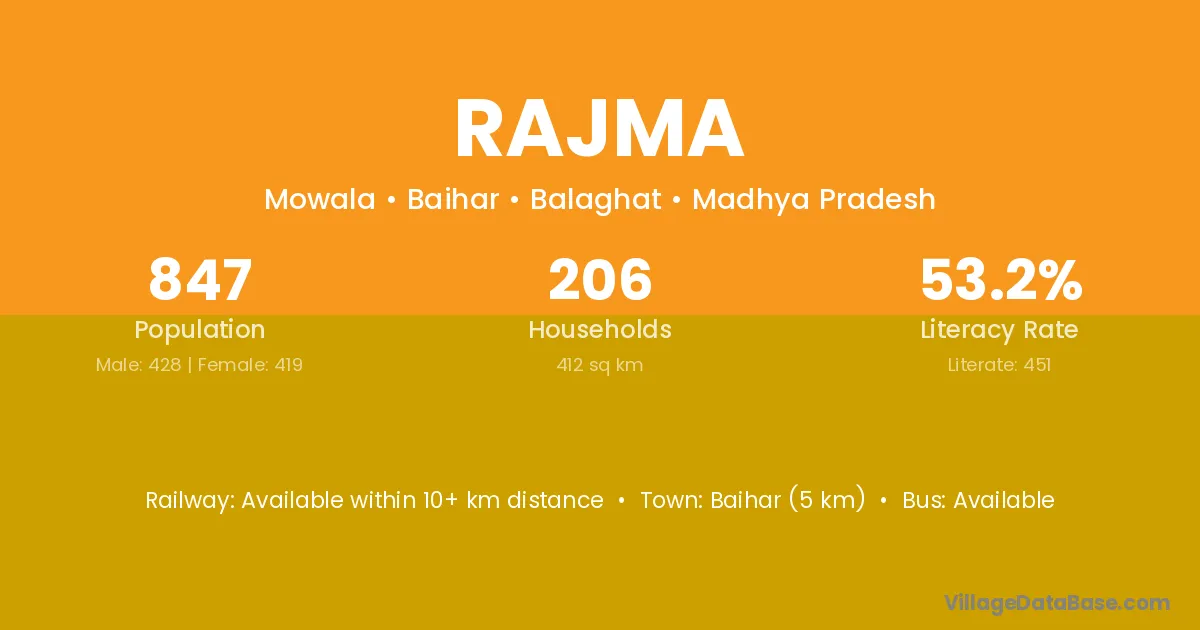 Baihar (5 km) is the nearest town to Rajma village for major economic activities and is located approximately 5 km away.