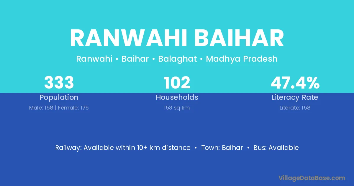 Ranwahi Baihar village has a total population of 333 people, of which 158 are males and 175 are females.