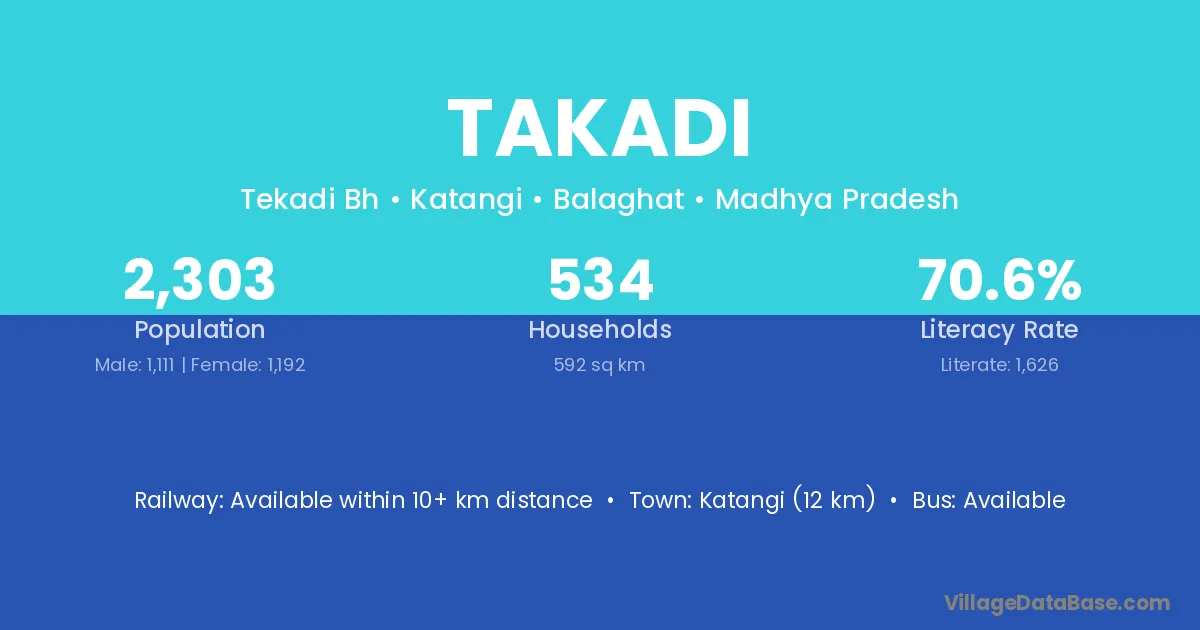 Katangi (12 km) is the nearest town to Takadi village for major economic activities and is located approximately 12 km away.