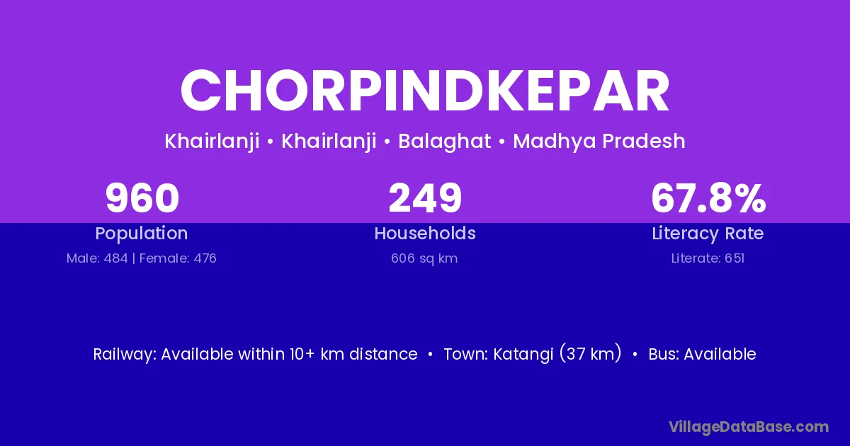 Katangi (37 km) is the nearest town to Chorpindkepar village for major economic activities and is located approximately 37 km away.