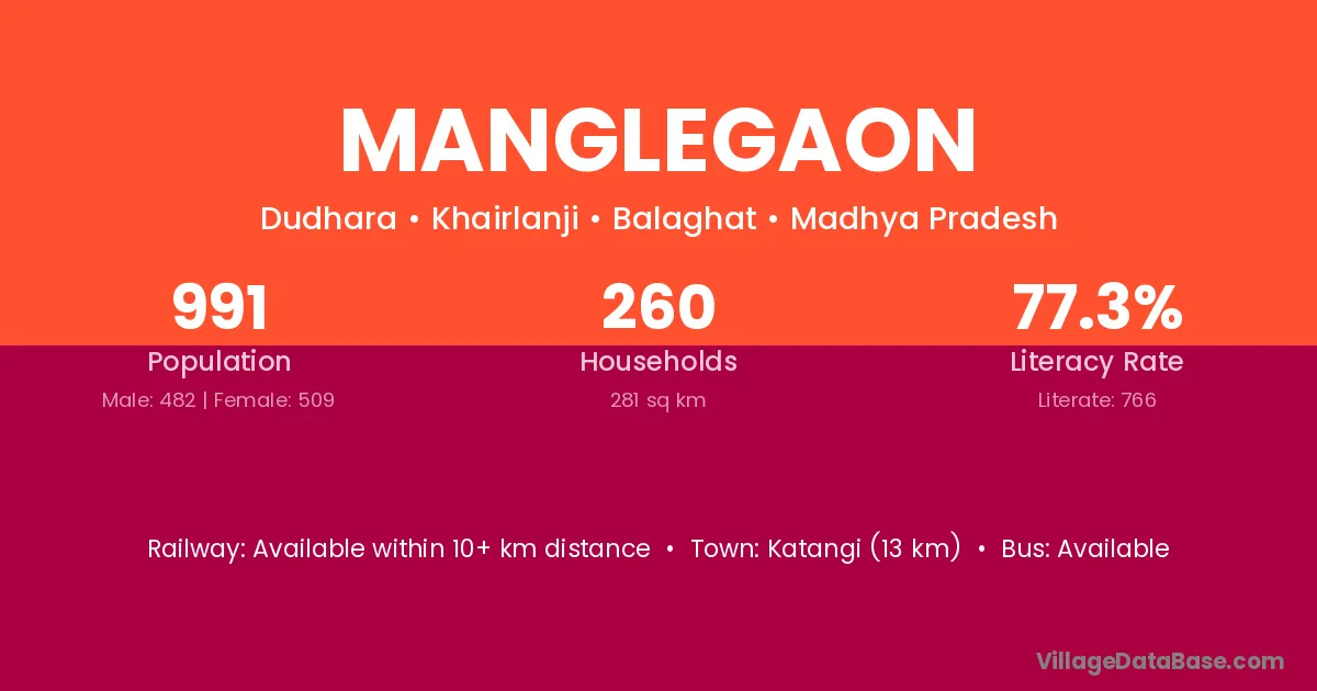 Katangi (13 km) is the nearest town to Manglegaon village for major economic activities and is located approximately 13 km away.