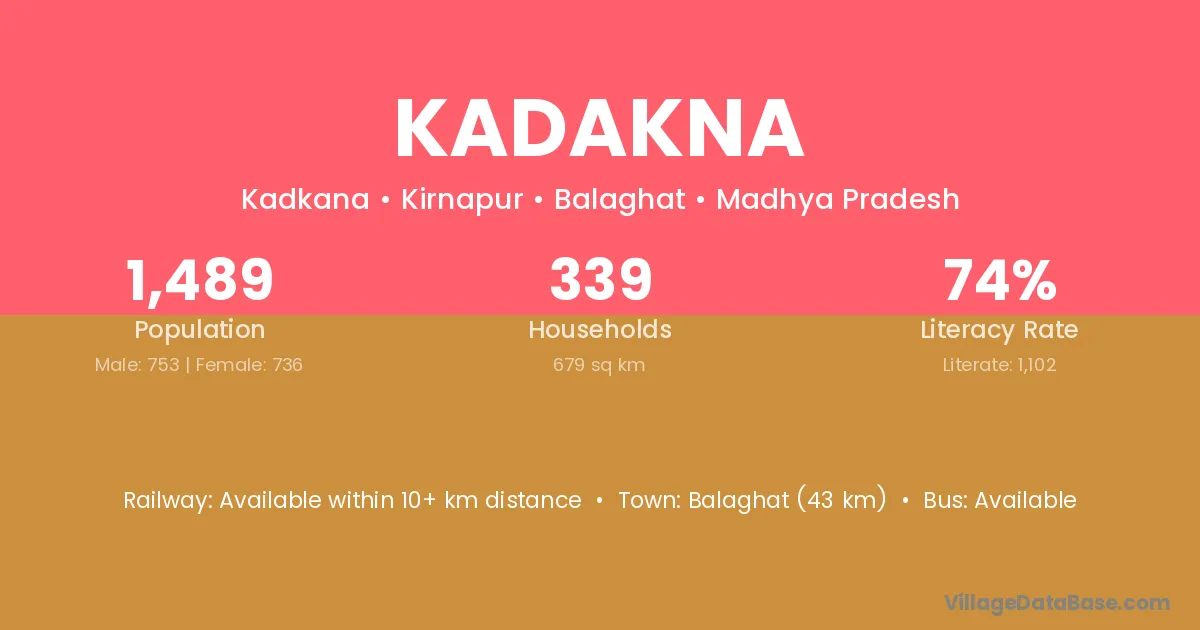 Balaghat (43 km) is the nearest town to Kadakna village for major economic activities and is located approximately 43 km away.