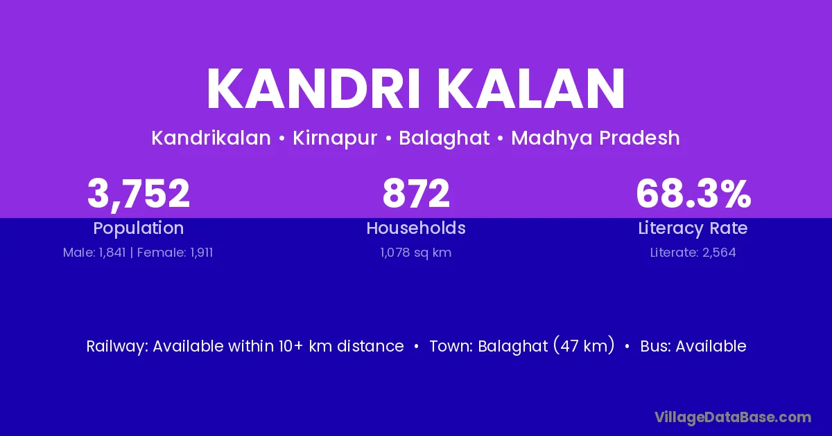 Balaghat (47 km) is the nearest town to Kandri Kalan village for major economic activities and is located approximately 47 km away.