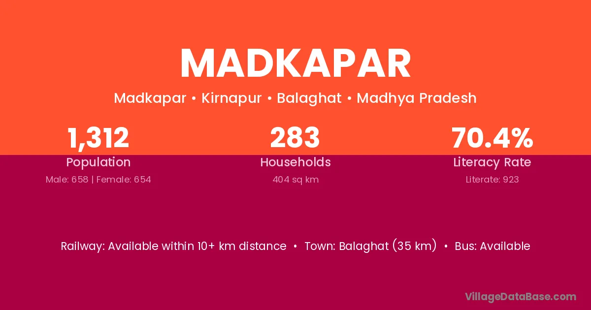 Balaghat (35 km) is the nearest town to Madkapar village for major economic activities and is located approximately 35 km away.