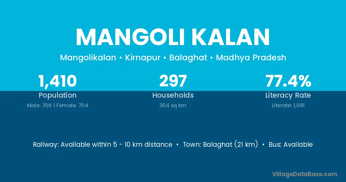 Balaghat (21 km) is the nearest town to Mangoli Kalan village for major economic activities and is located approximately 21 km away.