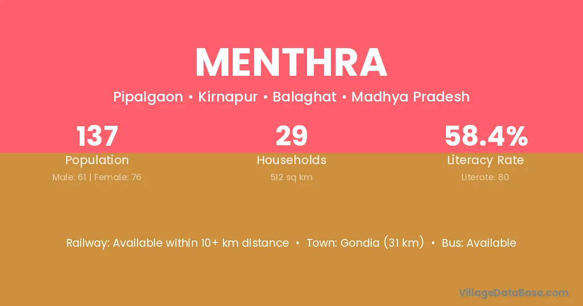 Gondia (31 km) is the nearest town to Menthra village for major economic activities and is located approximately 31 km away.