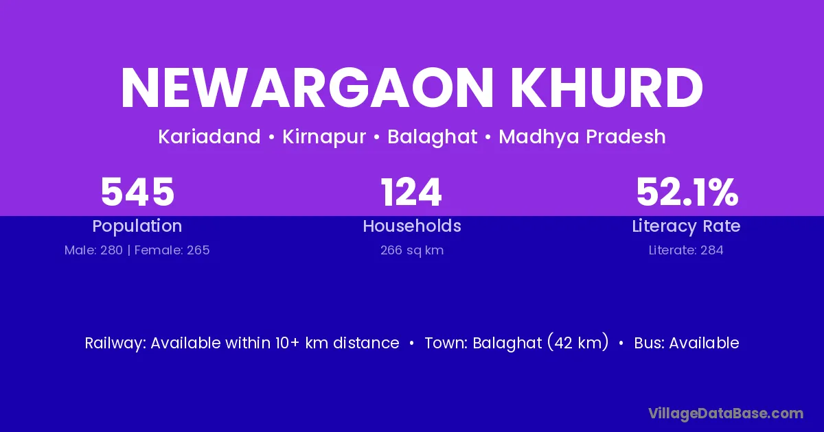 Balaghat (42 km) is the nearest town to Newargaon Khurd village for major economic activities and is located approximately 42 km away.