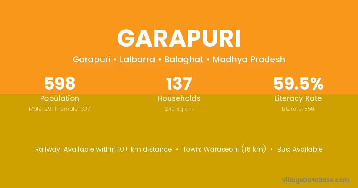 Waraseoni (16 km) is the nearest town to Garapuri village for major economic activities and is located approximately 16 km away.