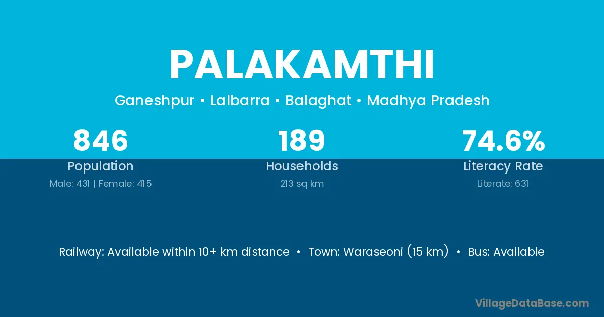 Waraseoni (15 km) is the nearest town to Palakamthi village for major economic activities and is located approximately 15 km away.