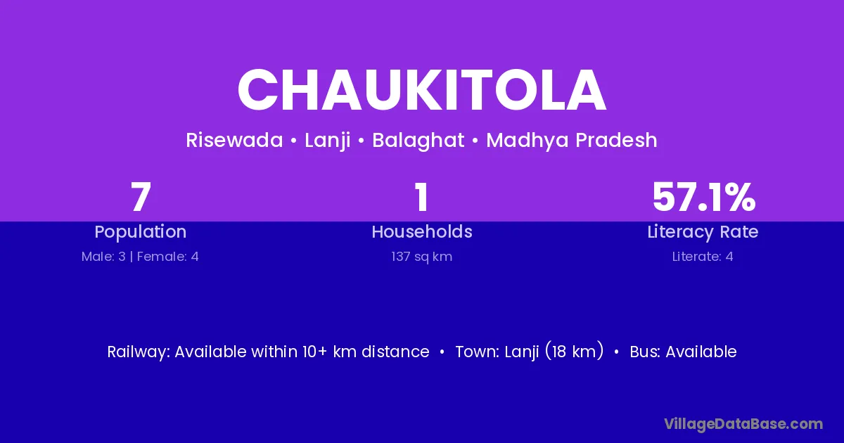 Lanji (18 km) is the nearest town to Chaukitola village for major economic activities and is located approximately 18 km away.