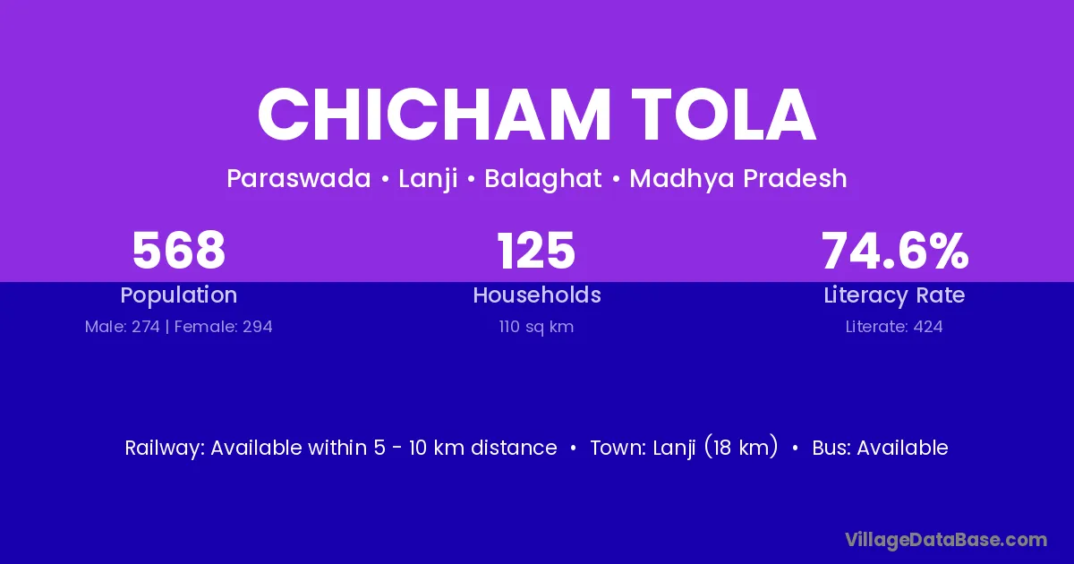Lanji (18 km) is the nearest town to Chicham Tola village for major economic activities and is located approximately 18 km away.