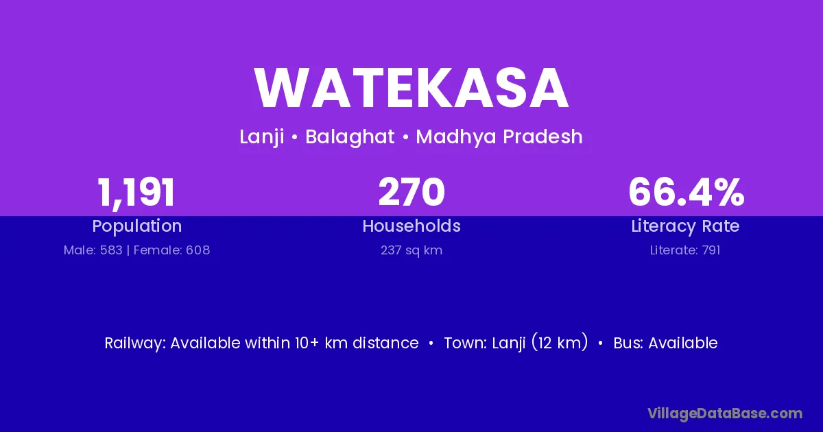 Watekasa village has a total population of 1,191 people, of which 583 are males and 608 are females.