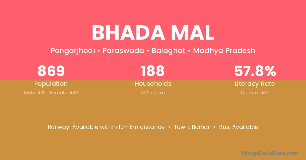 Baihar is the nearest town to Bhada Mal village for major economic activities