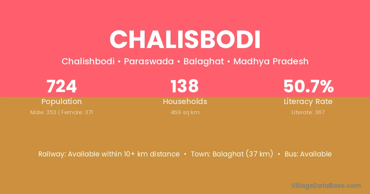 Balaghat (37 km) is the nearest town to Chalisbodi village for major economic activities and is located approximately 37 km away.