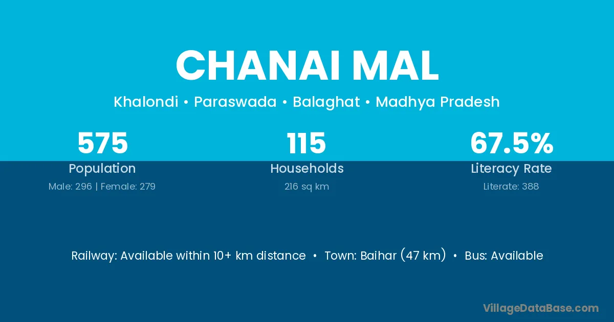 Baihar (47 km) is the nearest town to Chanai Mal village for major economic activities and is located approximately 47 km away.