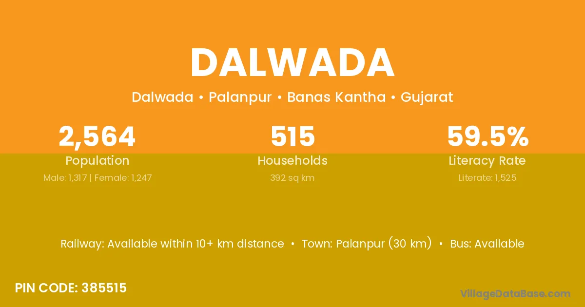 The literacy rate of Dalwada village is 59.66%. Male literacy stands at 64.96% and female literacy at 54.90%.