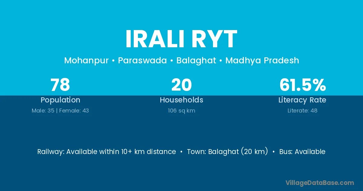 Balaghat (20 km) is the nearest town to Irali Ryt village for major economic activities and is located approximately 20 km away.