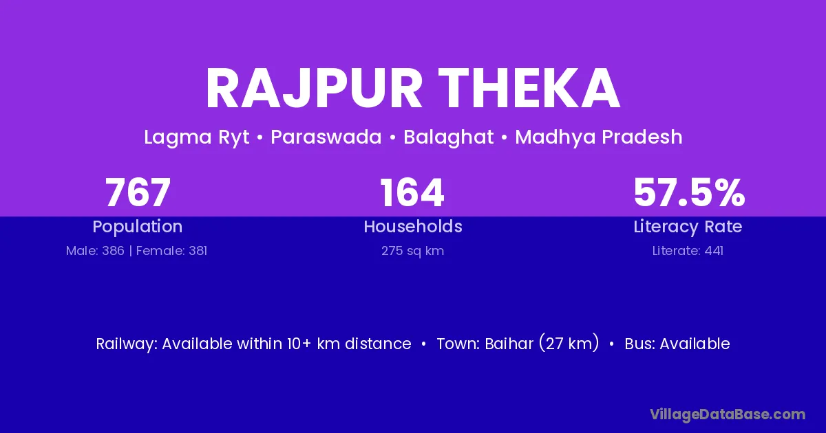 Rajpur Theka village has a total population of 767 people, of which 386 are males and 381 are females.