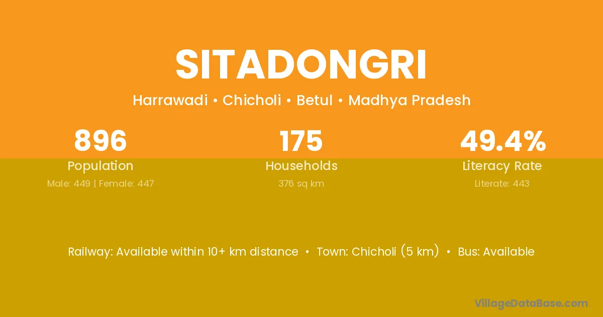 The literacy rate of Sitadongri village is 53.00%. Male literacy stands at 61.76% and female literacy at 44.96%.