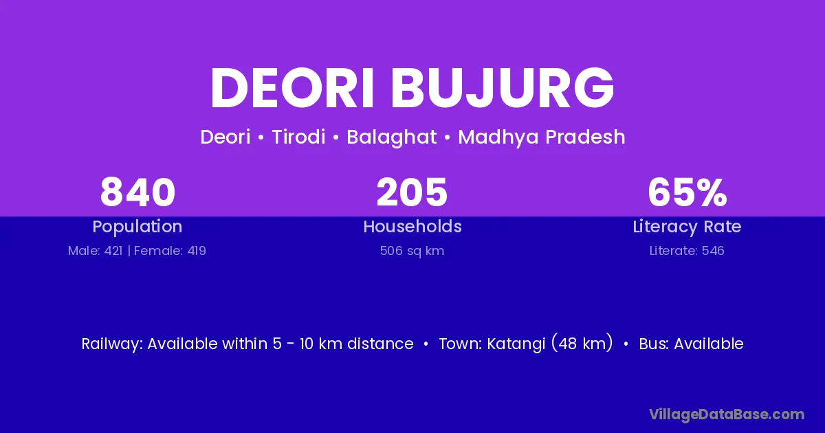 Katangi (48 km) is the nearest town to Deori Bujurg village for major economic activities and is located approximately 48 km away.