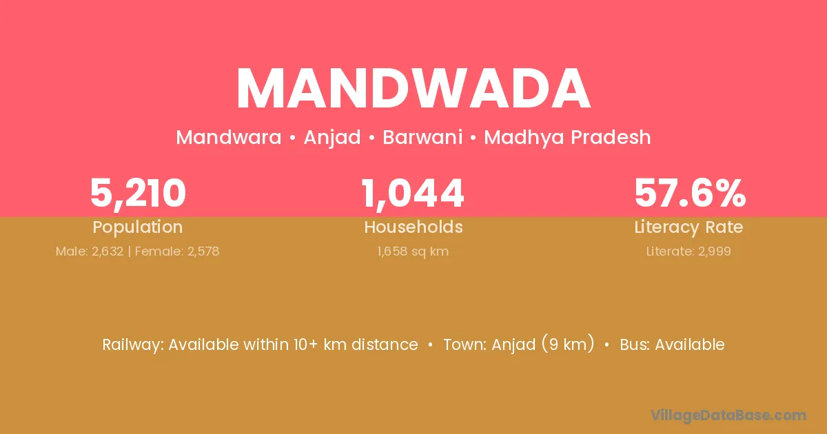 Mandwada village has a total population of 5,210 people, of which 2,632 are males and 2,578 are females.